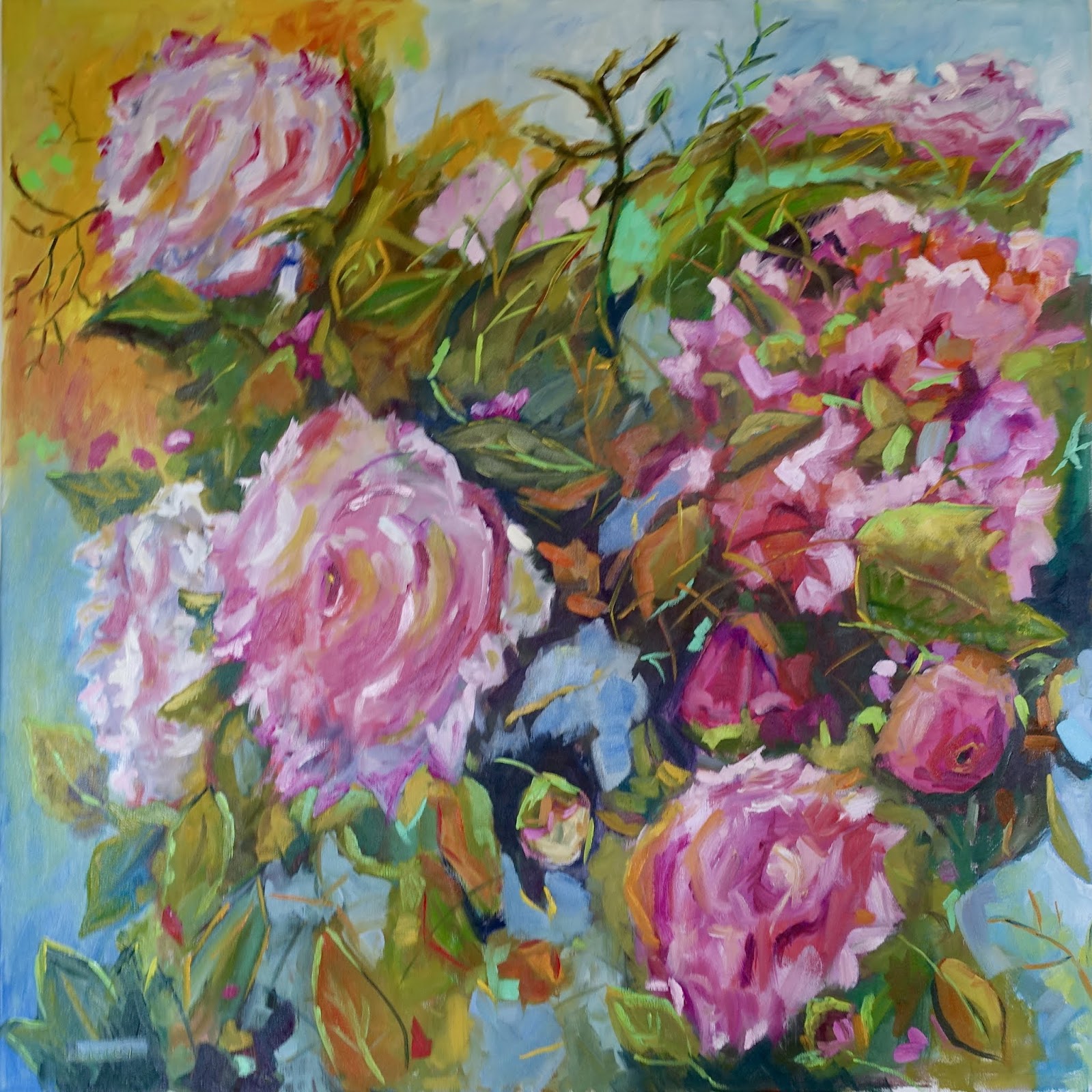 First peony sighting and out come the big brushes, the big brush strokes and the big bursts of energy. I couldn't walk by this canvas without picking up my brush and adding another blast of colour. Time disappears when creativity takes over.